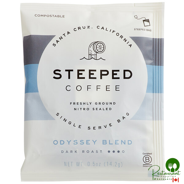 Offer high-quality, eco-friendly single serve coffee without the need for a coffee machine with this Steeped Coffee odyssey blend coffee single serve bag! These innovative, commercially compostable single serve coffee sachets are filled with the perfect pre-measured amount of direct trade, specialty micro-roasted coffee.