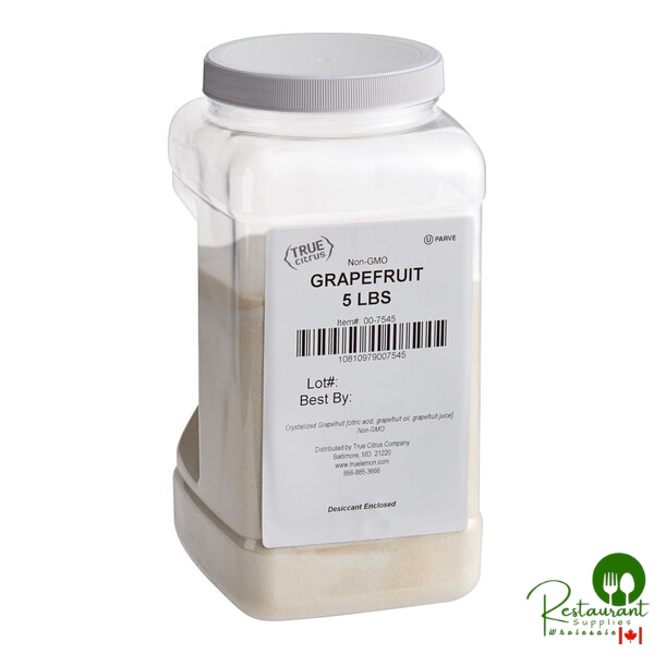 This True Citrus 5 lb. crystallized grapefruit powder features a granular texture and is made with whole fruit and fruit juices. This dry format is shelf-stable, light weight, and offers incredible versatility across wet or dry product applications.