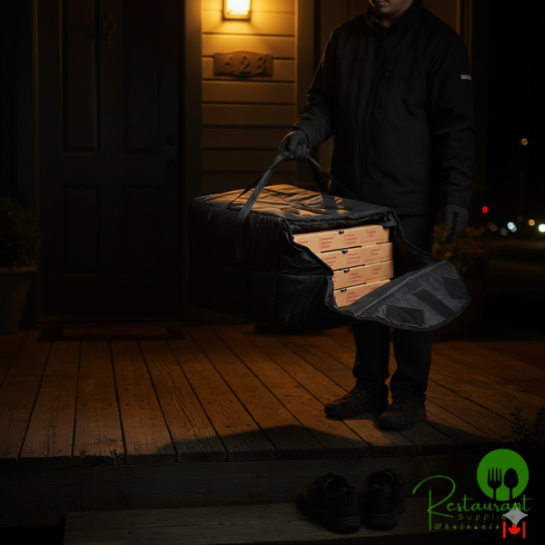 Revolutionize pizza delivery with the Vesture NextPhase insulated pizza bag featuring Bio-PCM Technology. This advanced carrier holds 5 Pizza Boxes with innovative thermal management.
