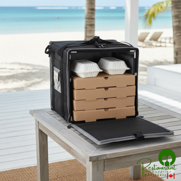 Designed to accommodate four 14-inch pizza boxes or various to-go containers, this backpack provides substantial capacity while maintaining comfortable carrying ergonomics. The end-load design facilitates easy loading and unloading during busy delivery operations.