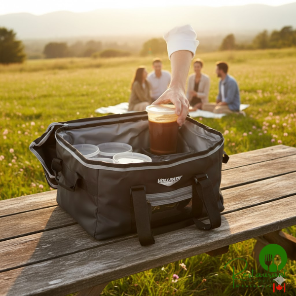This catering bag includes a specialized 12-compartment divider that keeps beverages, soups, and other liquids upright and organized during transport. The waterproof vinyl liner makes cleanup effortless, while the 1-inch polyester batting insulation with 8mm foil lining maintains consistent temperatures.