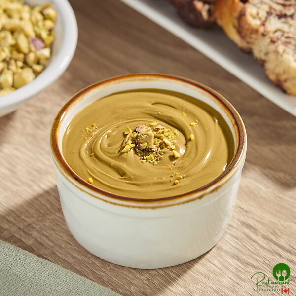 While this pistachio cream is delicious on its own, it can also be used in a wide range of applications. Swirl it into baked goods and confections such as cookies, no-bake dessert bars, or Dubai-style chocolate bars. Its sweet flavor and green hue make it an excellent choice for swirling into gelato, featuring inside delicate pastries, or serving as a gourmet spread alongside fruit and over toast. It's packaged in a bulk 40 lb. pail for high-volume establishments. No matter what you use it for, your patrons will fall in love with the sweet nutty flavor, simple ingredients, and versatility of this pistachio cream.