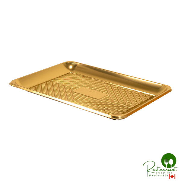 These Kado trays feature a sophisticated engraved design with a brilliant golden finish that beautifully accents and embellishes your desserts. Made from durable plastic, they retain their shape better than traditional paper trays while remaining easily disposable for convenient cleanup.