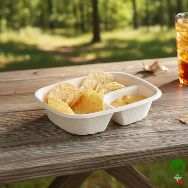 Perfect For: Food trucks, concession stands, restaurants, delis, stadiums, and any venue seeking sustainable food service solutions. The two-compartment design keeps foods separated while providing everything in one convenient, eco-friendly tray.